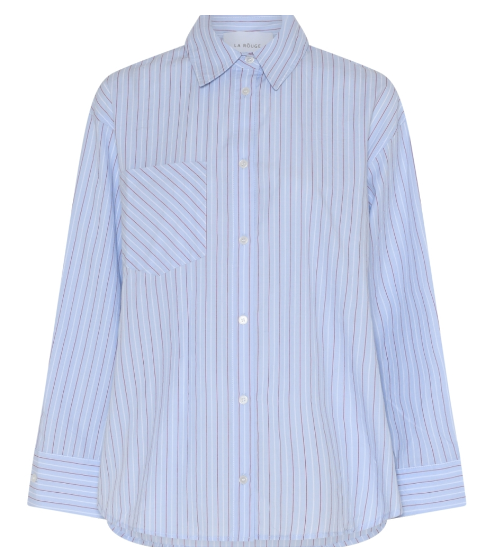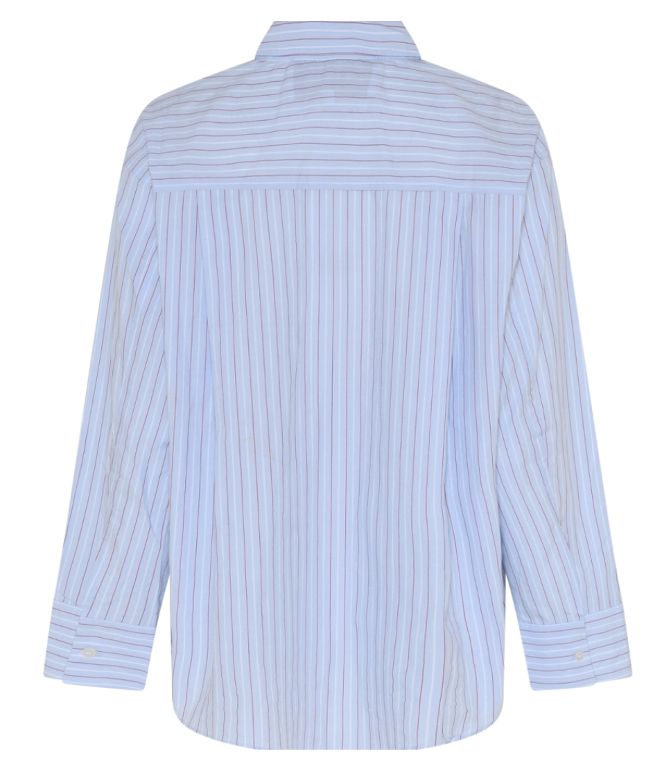 Josephine Oversize Shirt er en klassisk, løs skjorte med let brede ærmer, klassisk krave og knappelukning foran. Den er fremstillet i 100% bomuld med et fint og sommerligt stribet print. Skjorten har manchetter med to slidser og knaplukning, som giver et fint og fleksibelt udtryk. Foran er en enkel brystlomme, og bagpå fuldendes designet med bærestykke og læg – ét i hver side – der understreger den oversize pasform og giver et flot fald.