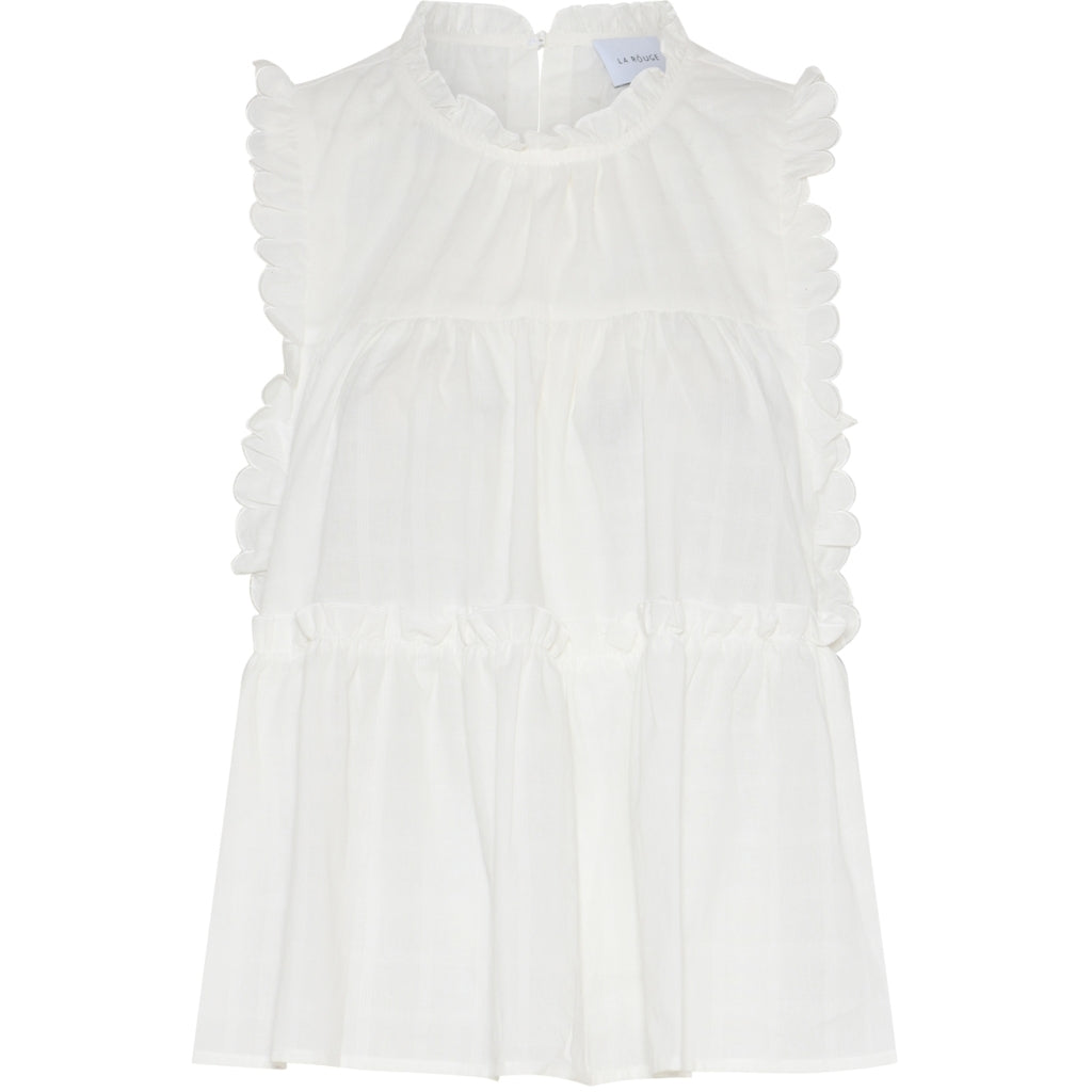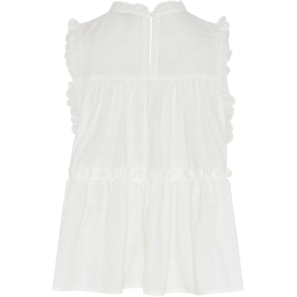 Julie Frill Top er en let bluse uden ærmer, opdelt i tre flæser, der skaber en smuk og løs A-form. Den har fine flæsekantdetaljer omkring ærmegabene, halsen og over den nederste flæse. Bagpå er en enkel lukning i nakken med knap og loop, som giver et diskret og elegant finish.