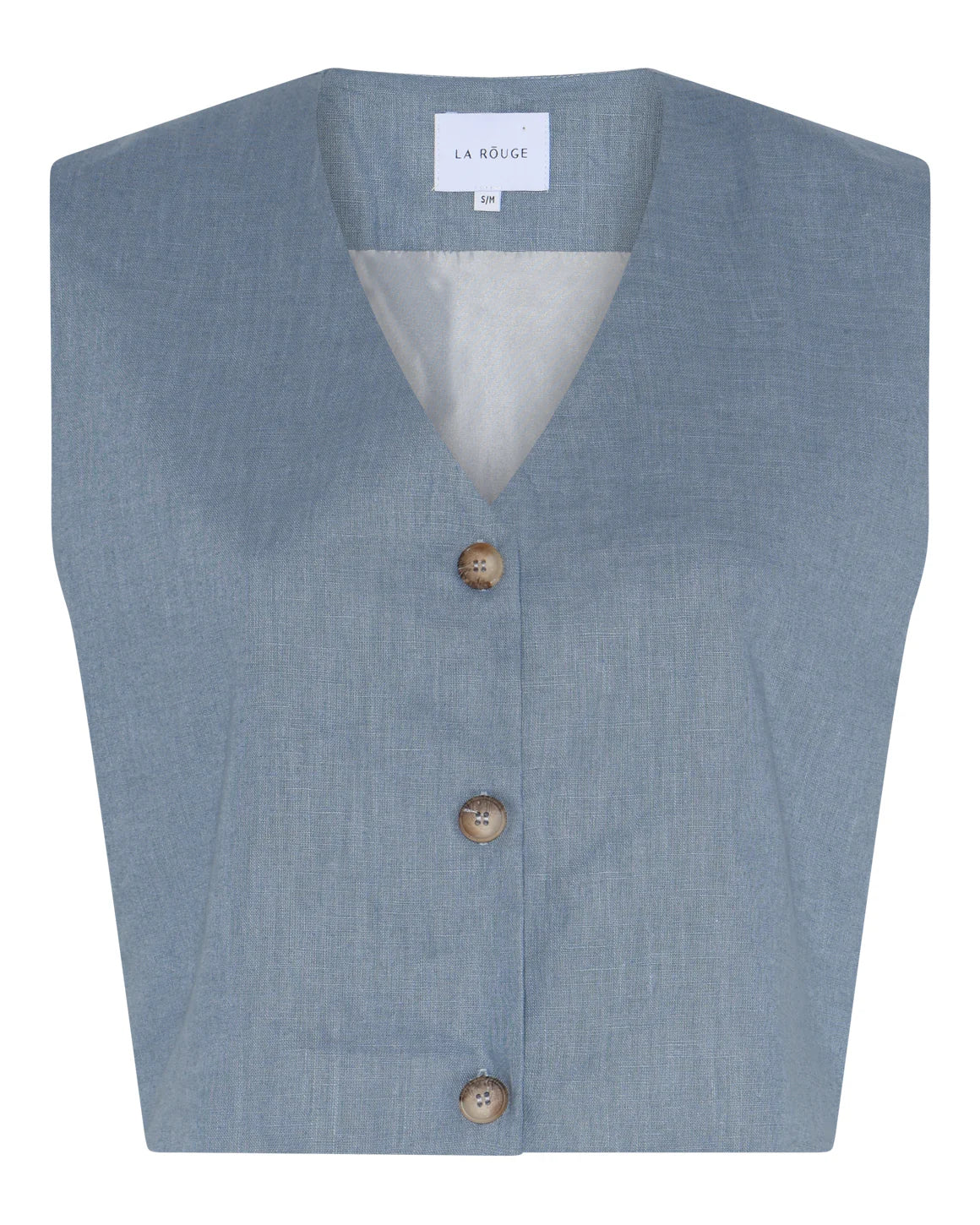 Mette Waistcoat er en fitted kort vest i en fast og lækker hørkvalitet med V-udskæring og tre knapper, der skaber et enkelt og stilrent look. Perfekt over en skjorte for et klassisk outfit eller alene med bare arme for et mere afslappet, sofistikeret udtryk. Kan kombineres med Mette Pants for et flot, sammenhængende sæt