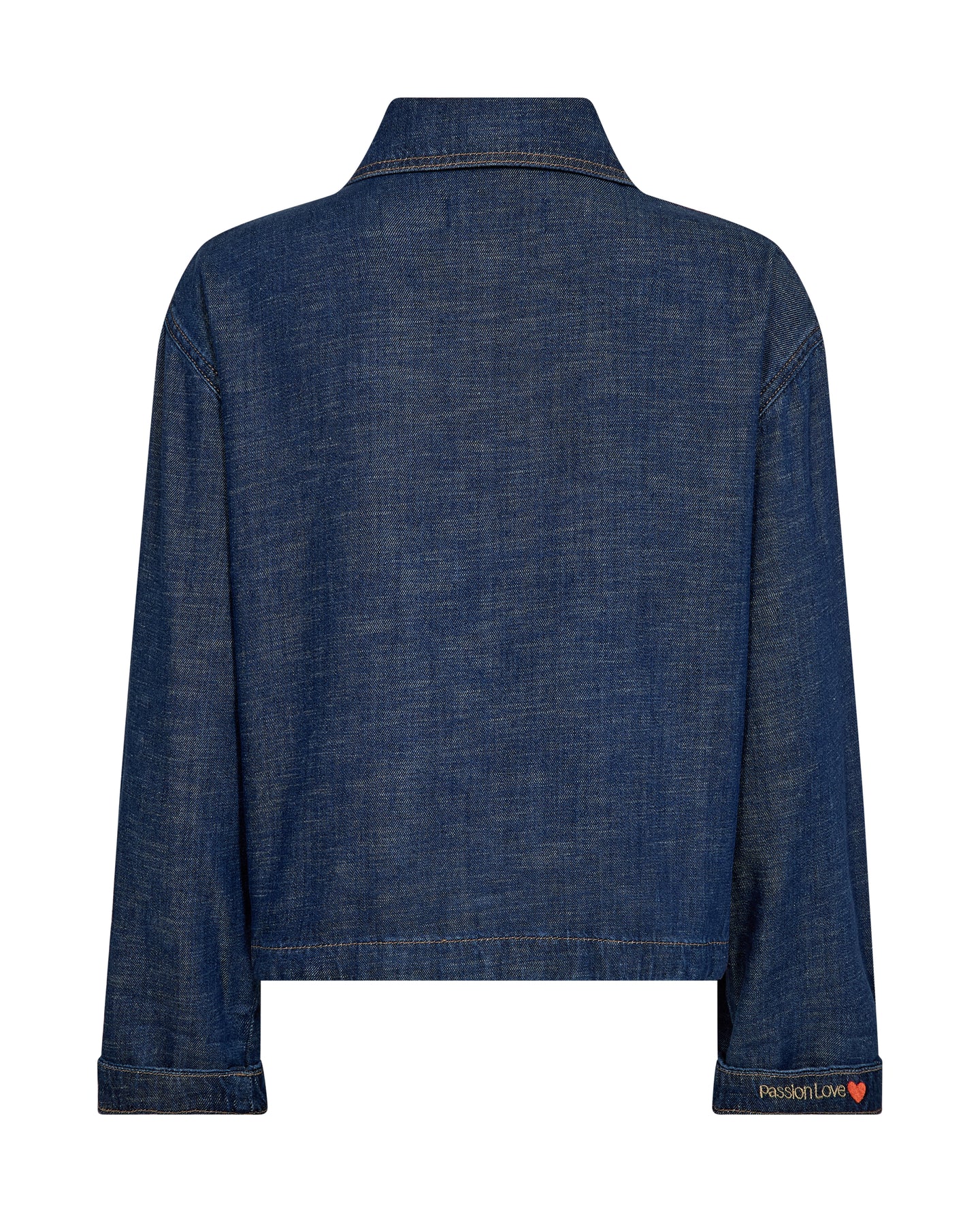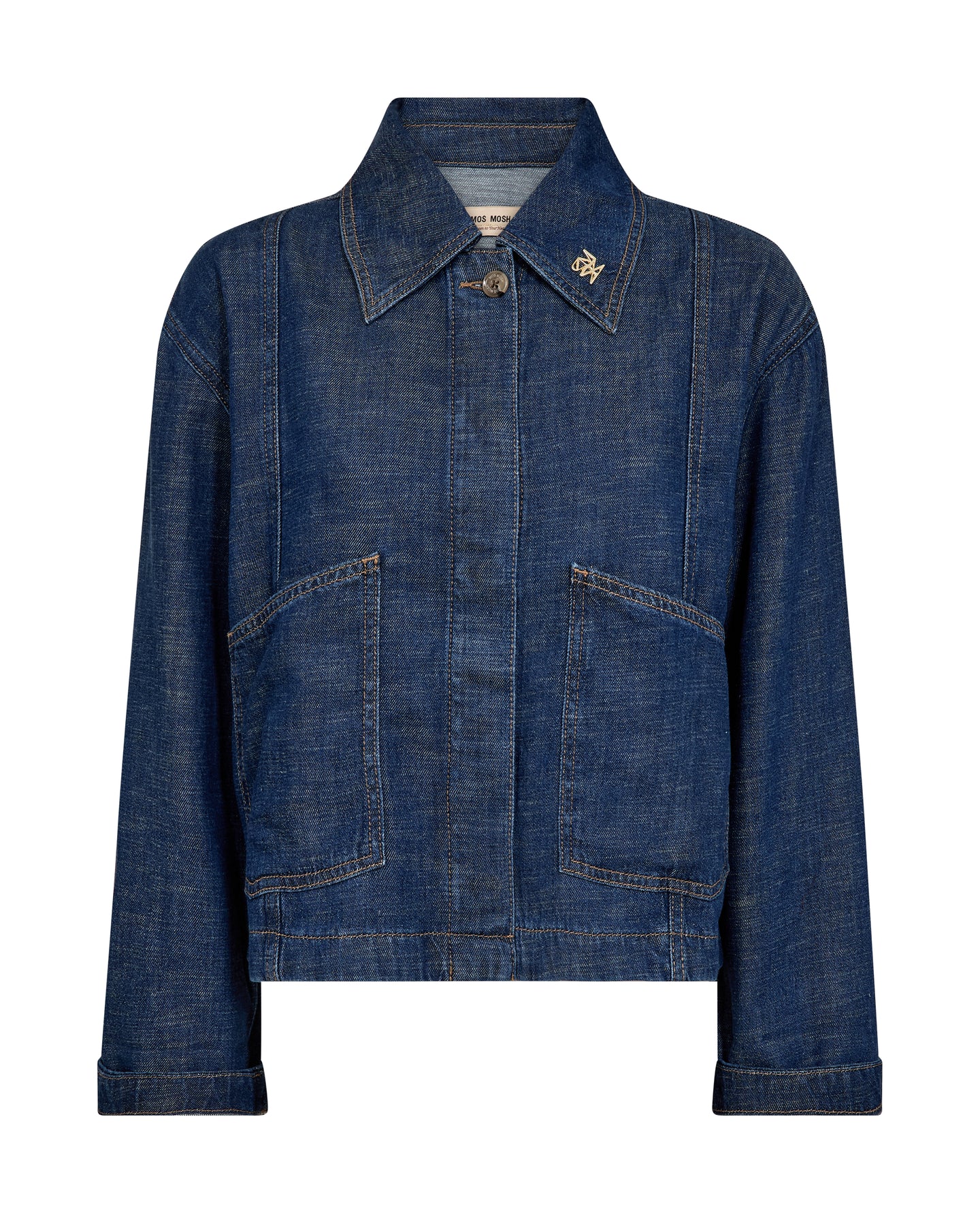 Stilren jakke i en dyb mørkeblå farve med et klassisk og moderne udtryk. Jakken har et enkelt, tidløst design med krave og knaplukning foran, som giver et let denim-inspireret look. På kraven foran er der en flot guld detalje. Den er udstyret med lommedetaljer, der tilfører både funktion og karakter, og pasformen er afslappet med et let struktureret snit.