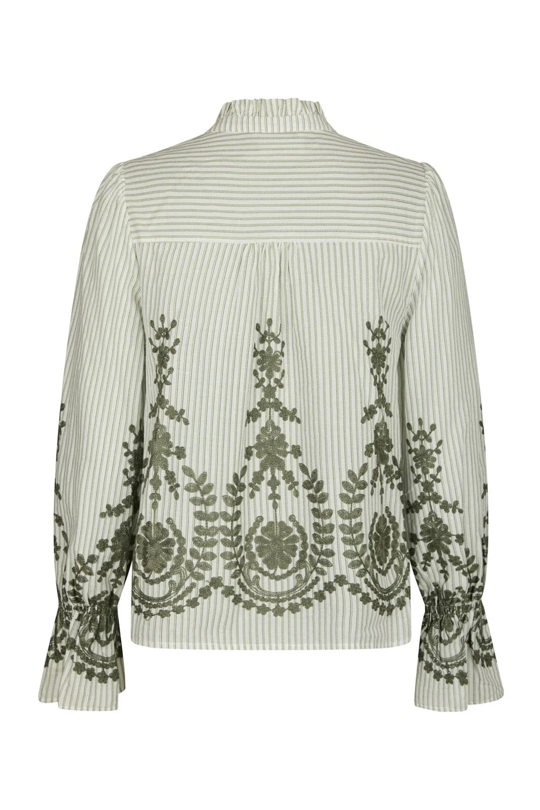 Bluse i støvet grøn med vertikale striber og blomsterbroderi på forsiden, bagsiden og ærmerne. Skjorten er designet med lange ærmer med flæsemanchetter, V-halsudskæring og i en løs pasform.
