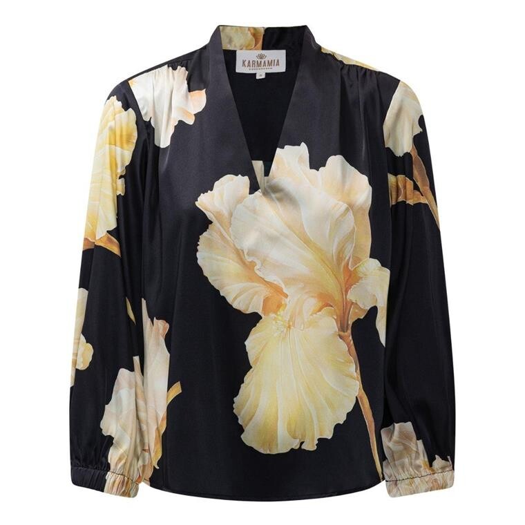 Fineste bluse i nyt smukt print fra Karmamia Copenhagen. Blusen er designet i en let og blank satinkvalitet, der falder flot on ens silhuet. Den har v-hals og små læg langs med skuldrene der giver et feminint udtryk. Ærmerne er lange og afsluttet med en elastikkant, bagpå er der et læg under bærestykket.