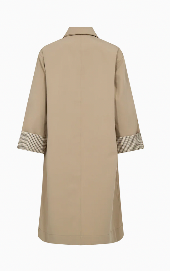 En moderne fortolkning af den tidløse trenchcoat. Denne frakke er designet i en afslappet pasform med klassisk krave, knaplukning og cropped ærmer med kontraststribede manchetter, der tilfører et raffineret touch. Fremstillet i en glat, let strækbar kvalitet, der giver et ubesværet sofistikeret udtryk – perfekt til lag-på-lag styling over både skræddersyede og afslappede looks.