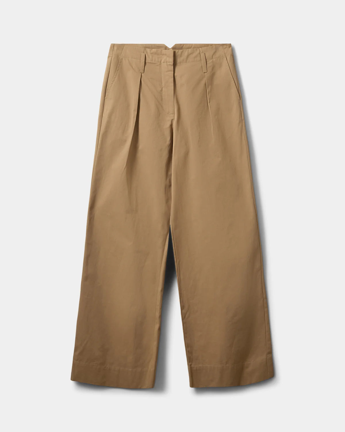 Bukser med vide ben og sidelommer, læg foran og bæltestropper i taljen.