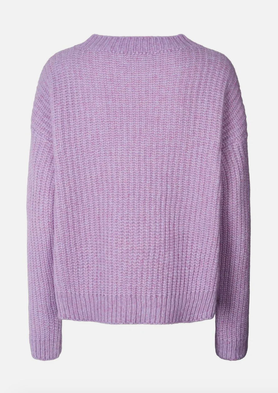 Trøjen er strikket i et klassisk patentstrik, som giver den en flot struktur og et voluminøst udtryk. Med sit oversize fit falder den afslappet og flot på kroppen. Den er detaljeret med en rund halsudskæring, lange ærmer og små slidser i siderne.