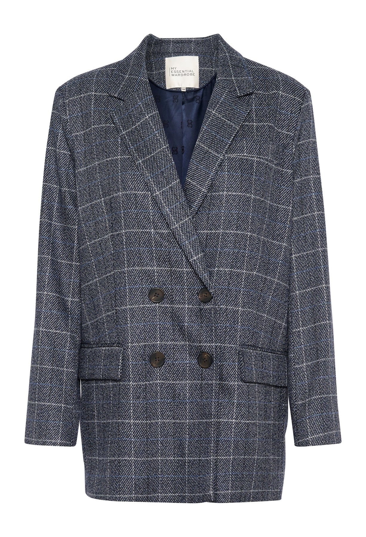 Cool og flot blazerjakke designet i et oversized fit. Jakken er dobbeltradet og har to lommer foran. Derudover har den knaplukning foran og ved enden af ærmerne.